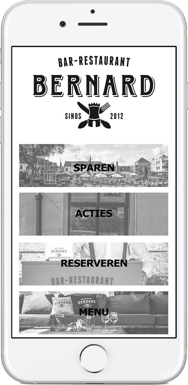 We ontwikkelden een app die informatie biedt én klanten bindt doormiddel van een spaarsysteem. Via de app kan de klant met een druk op de knop een tafel voor twee reserveren. De actuele openingstijden en menukaart bekijken en sparen voor korting of cadeautjes. Ook biedt de app digitale coupons en kan Restaurant Bernard zelfstandig pushberichten sturen om nieuws rechtstreeks met klanten te delen.