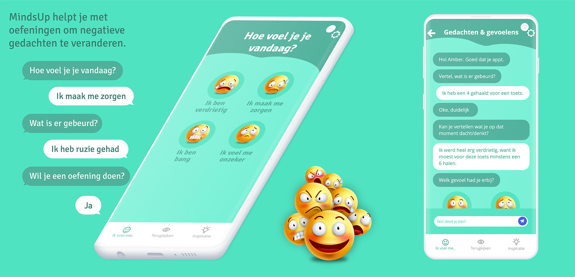 Tijdens het ontwikkelen van het idee zijn wij aangesloten en hebben de realisatie verzorgd. De app MindsUp kan je helpen wanneer niet lekker in je vel zit. Ben je vaak verdrietig, bang, bezorgd of onzeker? MindsUp helpt je met oefeningen en tips om hier mee om te gaan en je gedachten te veranderen. Door antwoord te geven op de vragen die MindsUp je stelt krijg je inzicht in je eigen gedachtepatronen en wordt je gestimuleerd om deze om te buigen naar iets positiefs. Daarnaast biedt MindsUp je de mogelijkheid om een dagboek bij te houden zodat je je gevoelens van je af kunt schrijven.